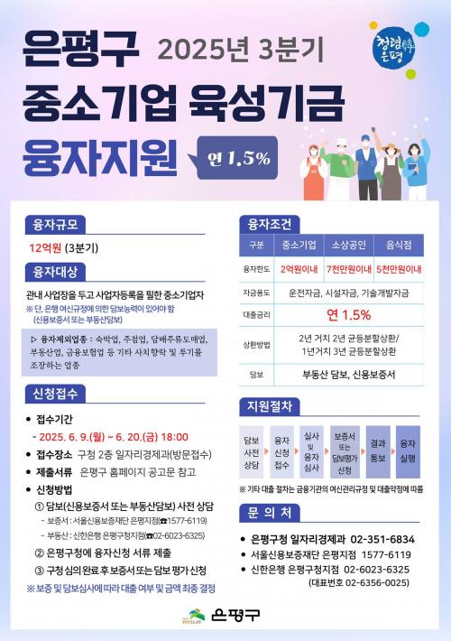[Çѱ¹BBC¹æ¼Û ÀºÆò±¸=À̽ŵ¿±âÀÚ] ¼­¿ï ÀºÆò±¸´Â Áö¿ª ³» Áß¼Ò±â¾÷ÀÇ °æ¿µ ¾ÈÁ¤À» µµ¸ðÇϰí Àڱݳ­ ÇØ¼Ò¸¦ Áö¿øÇϱâ À§ÇØ ¡®2025³â 3ºÐ±â Áß¼Ò±â¾÷ À°¼º±â±Ý À¶ÀÚÁö¿ø¡¯À» ½ÃÇàÇÑ´Ù°í ¹àÇû´Ù. À̹ø 3ºÐ±â¿¡´Â ÃÑ 12¾ï ¿ø ±Ô¸ðÀÇ À¶ÀÚ±ÝÀÌ Æí¼ºµÇ¾úÀ¸¸ç, ÀºÆò±¸ °ü³»¡¦