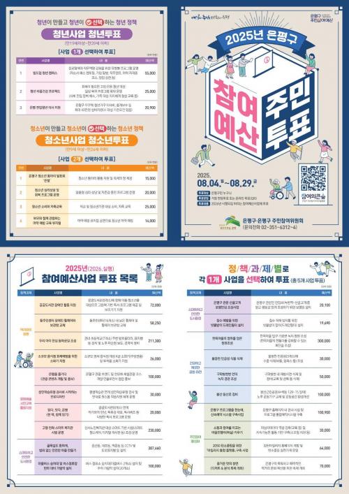[Çѱ¹BBC¹æ¼Û ÀºÆò±¸=À̽ŵ¿±âÀÚ] ÀºÆò±¸´Â 2026³â¿¡ ½ÇÇàµÇ´Â Âü¿©¿¹»ê»ç¾÷ ¼±Á¤À» À§ÇÑ ÁÖ¹ÎÅõÇ¥¸¦ 4ÀϺÎÅÍ ¿À´Â 29ÀϱîÁö ÁøÇàÇÑ´Ù°í ¹àÇû´Ù. ÁÖ¹ÎÅõÇ¥´Â 5°³ÀÇ Á¤Ã¥°úÁ¦º°·Î °¡Àå ¼±È£ÇÏ´Â »ç¾÷À» 1°³¾¿ ¼±ÅÃÇÏ´Â ¹æ½ÄÀ¸·Î, ÃÑ 5°³ »ç¾÷¿¡ ÅõÇ¥ÇÏ°Ô µÈ´Ù. ÅõÇ¥ ¡¦