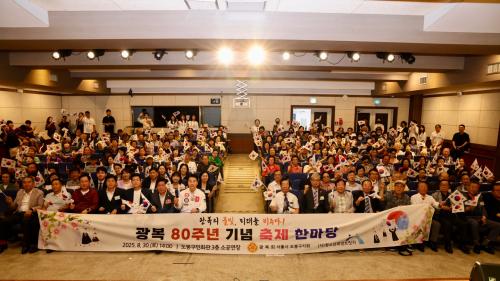 [Çѱ¹BBC¹æ¼Û µµºÀ±¸=À̽ŵ¿±âÀÚ] ¼­¿ï µµºÀ±¸°¡ Áö³­ 8¿ù 30ÀÏ µµºÀ±¸¹Îȸ°ü 3Ãþ ¼Ò°ø¿¬Àå¿¡¼­ ¿­¸° ±¤º¹ 80Áֳ⠱â³ä ¡®±¤º¹ÀÇ ºÒºû, ¹Ì·¡¸¦ ºñÃß´Ù¡¯ Çà»ç°¡ ¼ºÈ²¸®¿¡ ¸·À» ³»·È´Ù°í ¹àÇû´Ù. ±¤º¹È¸ µµºÀ±¸Áöȸ°¡ ÁÖ°üÇÑ À̹ø Çà»ç´Â ±¤º¹ÀÇ °¡Ä¡¸¦ ±â¸®°í ¹Ì·¡¼¼¡¦