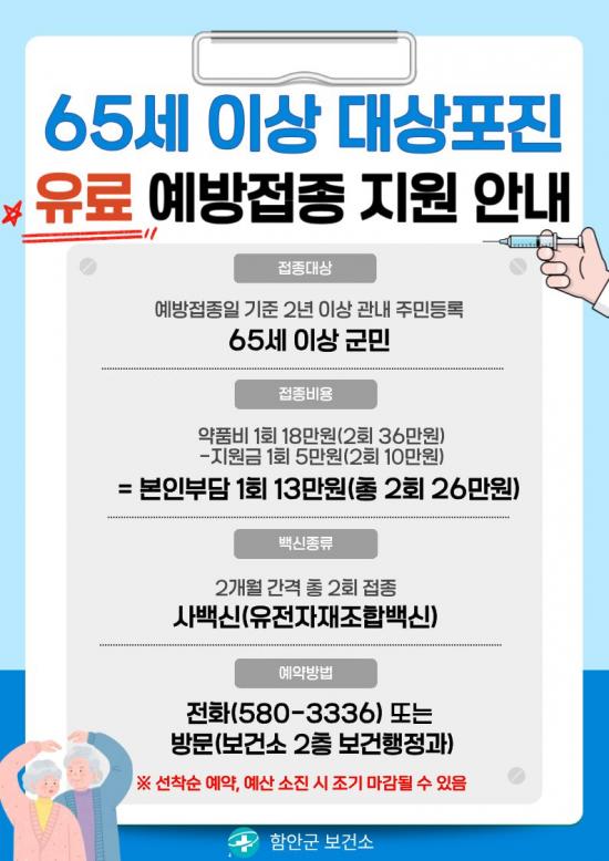 [Çѱ¹BBC¹æ¼Û °æ³²ÇÔ¾È=À̽ŵ¿±âÀÚ] ÇԾȱºº¸°Ç¼Ò´Â 2026³â ´ë»óÆ÷Áø ¿¹¹æÁ¢Á¾À» 1¿ù 2ÀϺÎÅÍ ¿¹¾à Á¢¼öÇϸç, Á¢Á¾ ½Ç½Ã´Â 2¿ùºÎÅÍ ÁøÇàÇÑ´Ù°í ¹àÇû´Ù. Á¢Á¾ ´ë»óÀº ¿¹¹æÁ¢Á¾ÀÏ ±âÁØÀ¸·Î 2³â ÀÌ»ó °ü³» Áֹεî·ÏÀ» µÎ°í °ÅÁÖÇÑ 65¼¼ ÀÌ»ó ÁÖ¹ÎÀÌ´Ù. Á¢Á¾À» Èñ¸ÁÇϴ¡¦