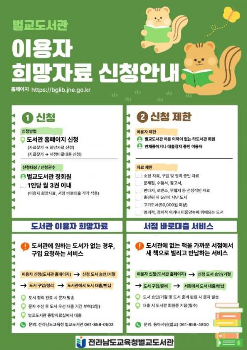 [Çѱ¹BBC¹æ¼Û Àü³²¹ú±³=À̽ŵ¿±âÀÚ] Àü¶ó³²µµ±³À°Ã»¹ú±³µµ¼­°üÀº µµ¼­°ü ÀÌ¿ëÀÚÀÇ µ¶¼­ ¸¸Á·µµ¸¦ ³ôÀ̰í ÀÚ·á ÀÌ¿ë ÆíÀǸ¦ °­È­Çϱâ À§ÇØ ¡®ÀÌ¿ëÀÚ Èñ¸ÁÀÚ·á ¼­ºñ½º¡¯¿Í ¡®¼­Á¡ ¹Ù·Î´ëÃâ¼­ºñ½º¡¯¸¦ ¿î¿µÇϰí ÀÖ´Ù. ¡®ÀÌ¿ëÀÚ Èñ¸ÁÀÚ·á ¼­ºñ½º¡¯´Â µµ¼­°ü¿¡ ¼ÒÀåµÇ¾î¡¦