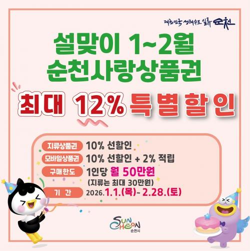 [Çѱ¹BBC¹æ¼Û ¼øÃµ=±è¿ëÈÆ ±âÀÚ] ¼øÃµ½Ã´Â ½Ã¹ÎµéÀÇ Àå¹Ù±¸´Ï ºÎ´ãÀ» ´ú°í Áö¿ª ³» ¼Òºñ¸¦ ÃËÁøÇϱâ À§ÇØ 1¿ùºÎÅÍ ÃßÁø ÁßÀÎ ¼øÃµ»ç¶û»óǰ±Ç ÇÒÀÎÇà»ç¸¦ ¼³ ¸íÀýÀ» Æ÷ÇÔÇØ 2¿ù ¸»±îÁö Áö¼Ó ¿î¿µÇÑ´Ù°í ¹àÇû´Ù. ½Ã¿¡ µû¸£¸é 2026³â 1¿ùºÎÅÍ ÁøÇà ÁßÀÎ ¼øÃµ»ç¶û»óǰ±Ç¡¦